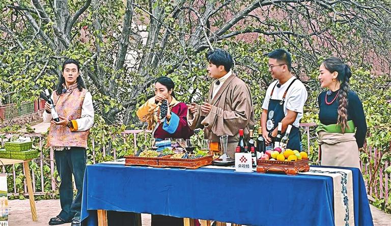 穿過湖邊棧道,探訪團在棧道涼亭,品嘗人參果、風干牦牛肉、藏雞、霍爾巴羊……仿佛只需要用味蕾,就能描摹出這片土地的質樸。