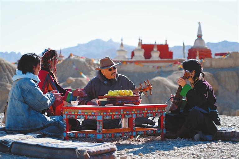 在參觀古格紅殿時,探訪團發(fā)現(xiàn)壁畫中出現(xiàn)了很多種樂器,其中的果沃琴等樂器至今還在阿里地區(qū)流行。從對古格王朝遺址的歷史沉思中走出,探訪團在古格山腳下體驗了當地傳統(tǒng)民族樂器,觀看了阿里首部歷史情景劇《夢回古格》中的宣舞選段,演員們的傾情表演,讓探訪團一睹紅殿壁畫中的“現(xiàn)實版”宣舞。