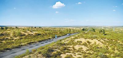 登上杭錦旗第一條穿沙公路旁的防火瞭望塔,四下遠(yuǎn)望,只見公路兩側(cè)的沙地,被沙生植物覆蓋起來。這條全長(zhǎng)115公里的黑色柏油路,從杭錦旗錫尼鎮(zhèn)出發(fā),猶如一把利劍,直插庫(kù)布其沙漠腹地,硬生生將沙漠?dāng)r腰劈斷。