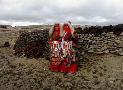 瑪旁布姆卡是西女國女王居住的城堡,普蘭縣文化局局長加措根據(jù)藏文大字典和《阿里史地探秘》的“瑪旁布莫卡”,解釋出“布”的漢文詞義,就是女人、女性、女子或者女王?!澳本褪窍悴莼蛘呦悴荼椴即松?。據(jù)當(dāng)?shù)匕傩战榻B,城堡遺址坐落在普蘭神湖瑪旁雍措湖的東部扎藏布溫泉溝南側(cè)的野嶺上,海拔5000米上下。在遺址上部高處還有一個碩大蘑菇形狀的巖石巋然迎風(fēng)屹立城堡上方,與下方城堡遺址交相輝映。這即是“出俞石、朱砂、麝香、牦牛、駿馬、蜀馬,尤多鹽,恒將鹽向天竺興販,其利數(shù)倍”西女王國的王城。在城堡上方更高處的山后,遺留有眾多的洞穴,說明女國的百姓就居住在女王的周圍。此外在山坡的下方扎藏布溝處,當(dāng)?shù)匕傩辗Q這塊地方為“卡爾青”,意思是大城堡之地。盡管史書上的記載十分有限,瑪旁布姆卡的故事仍然世世代代流傳在當(dāng)?shù)匕傩盏男闹小;魻柎逡晃荒赀~的老百姓告訴筆者,溫泉溝和曲古寺廟附近就有許許多多女王的傳說,聽說女王曾經(jīng)在此沐浴,但不知具體在什么地方。