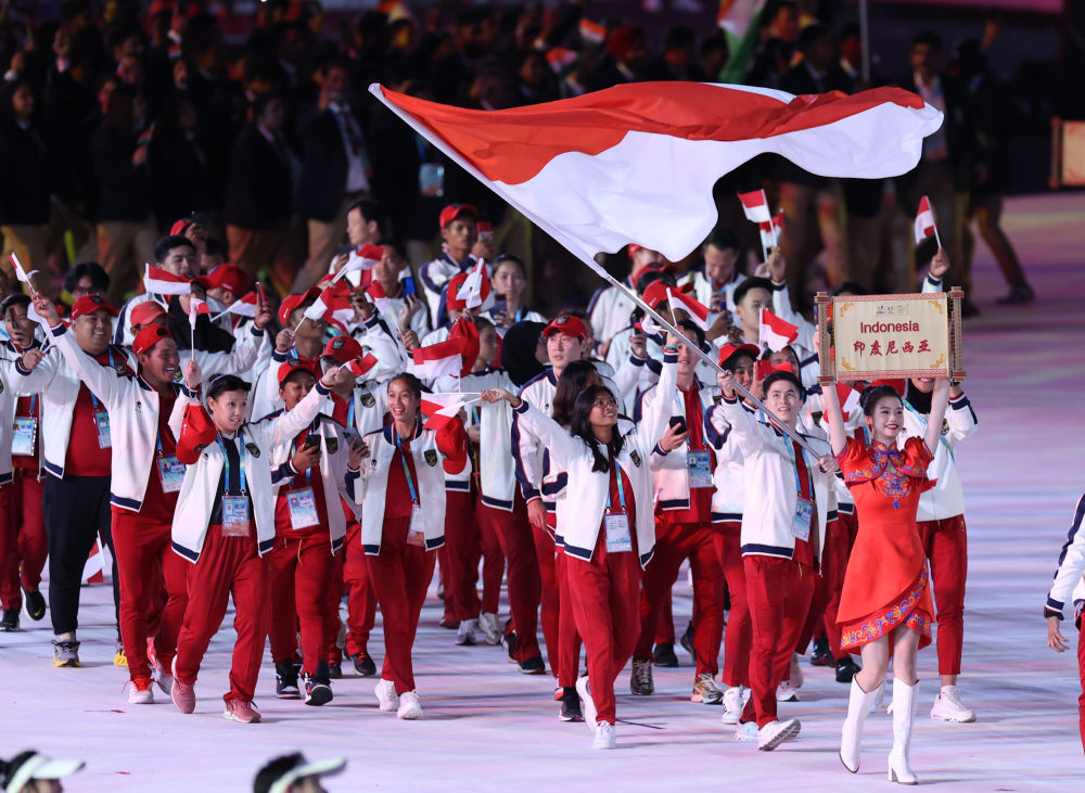 7月28日,印度尼西亞大學(xué)生體育代表團在開幕式上入場。新華社記者 張麗蕓 攝